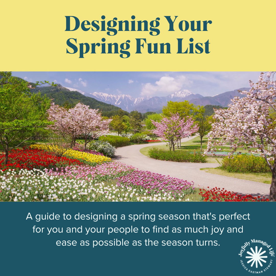 A guide to help you design a spring fun list that's perfect for you and your family. You'll go through a simple process to determine what matters to you during this season, get inspired by ideas, and use printable templates and short checklists to put your plan into action. I've also added in some of my most popular productivity bonuses to help you out at work and home while you're at it.