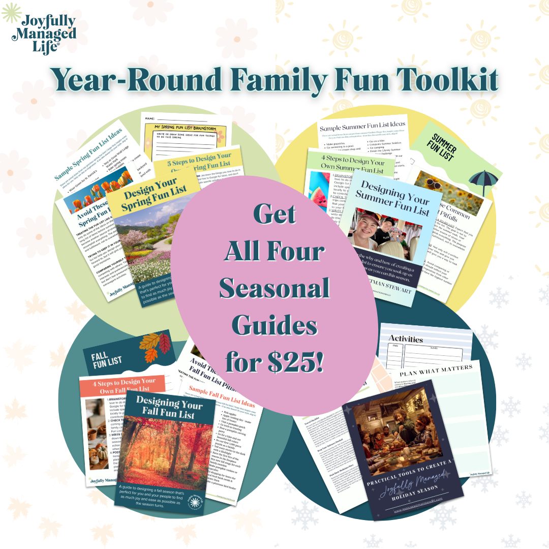A guide to help you design a summer fun list that's perfect for YOU. You'll go through a simple process to determine what matters to you during this season, get inspired by ideas, and use printable templates and short checklists to put your plan into action.